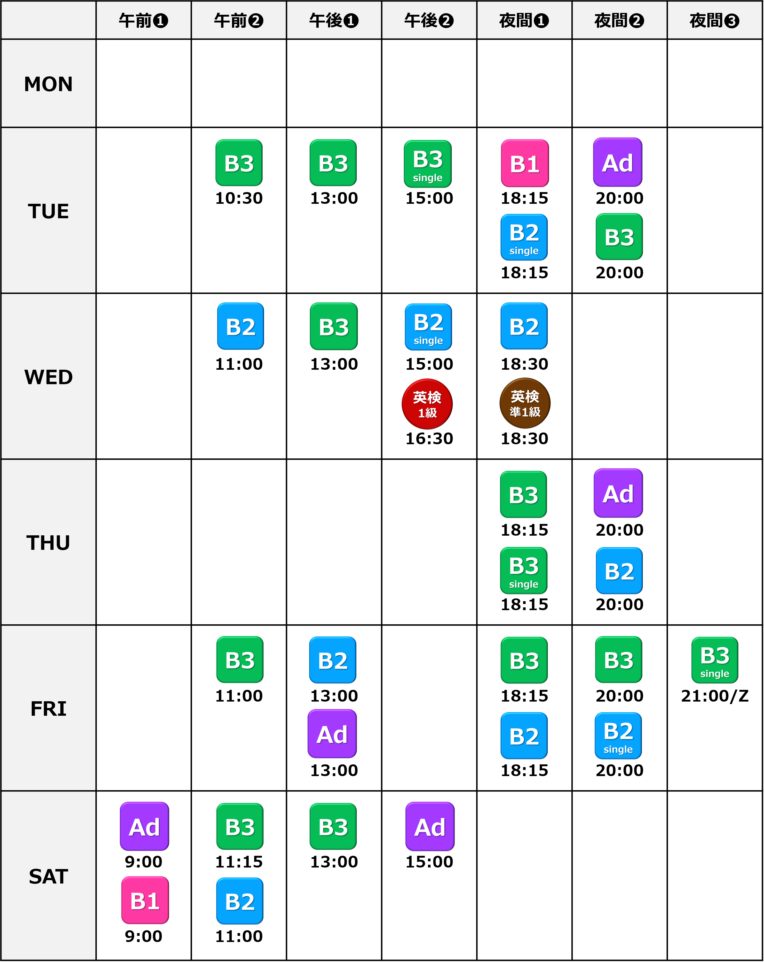 | 開始00分 | クラス体験 実際のクラスに入ってメンバーと同様に体験していただきます。 予習復習範囲については事前にご案内します。※やってこれなくても大丈夫です |